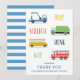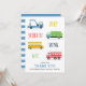 Um cartão de agradecimento de festa de aniversário infantil com caminhão de reboque, caminhão de lixo, ônibus escolar e caminhão de bombeiros.