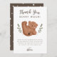 Cartão de agradecimento de tema de urso fofo para festa de aniversário infantil com ilustração de um filhote rolando de costas com folhas verdes nas laterais. A mensagem agradece os convidados por terem comparecido à festa. O texto no topo diz "muito obrigado, BEARY!" Ótimo para a festa com tema florestal do seu filho.