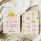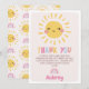 Lindo cartão de agradecimento de aniversário do nosso pequeno solzinho com um sol fofo, texto multicolorido e arco-íris em um fundo rosa. Este cartão de agradecimento de aniversário com tema de sol é uma maneira fofa de agradecer aos convidados por virem à festa de aniversário com tema de sol da sua pequena.