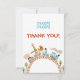 Cartão de agradecimento de aniversário do trem chugga chugga para meninos modernos, apresentando um trem principalmente azul com animais da savana, colinas e trilhos de trem.