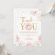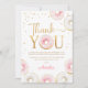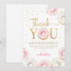 Cartão de agradecimento de festa de 1º aniversário doce com donuts rosa e branco. Design moderno e fofo com donuts rosa e branco em aquarela. Caracteriza fonte de tipografia script um. Você pode escolher convites impressos e/ou modelo digital para download instantâneo. Perfeito para uma celebração de primeiro aniversário feminino e elegante.
