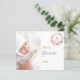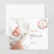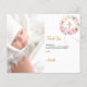 Um cartão de agradecimento de batismo moderno e elegante. Um fundo branco chic decorado com uma coroa floral rosa e branca em aquarela, um laço rosa e uma cruz dourada. Personalize e adicione a foto da criança, nota de agradecimento e nome.