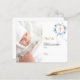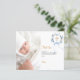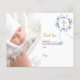 Um cartão de agradecimento de batismo moderno e elegante. Um fundo branco chic decorado com uma coroa floral azul aquarelada, um laço e uma cruz dourada. Personalize e adicione sua foto da criança, nota de agradecimento e nome.