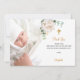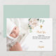 Um cartão de agradecimento de batismo moderno e elegante. Um fundo branco chic decorado com uma peônia branca pintada à aguarela, floral, folhagem de eucalipto e folhas de ouro falso. Personalize e adicione a foto da criança, nota de agradecimento e nome.
