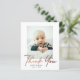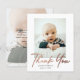 Cartão de Agradecimento de Bebê com Foto e Roteiro Mínimo no Orçamento. O verso inclui uma mensagem da família e uma 2ª foto. Clique no botão de edição para personalizar este design com suas fotos e detalhes.
