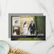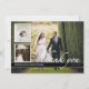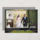 Um design elegante em preto e branco que apresenta uma foto completa da noiva e do noivo com duas fotos menores inseridas na frente e um espaço para sua mensagem personalizada de agradecimento no verso. O estilo elegante em preto, branco e cinza é atemporal e clássico.