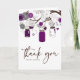 Ilustrações caprichosas de potes de pedra roxos pendurados em uma árvore com cordas em forma de coração, dois passarinhos e uma variedade de flores. Este cartão de agradecimento de casamento tem itens correspondentes. Este convite de pote de pedra seria perfeito para casamentos de primavera, inverno e ao ar livre. Este faz parte de um conjunto de convites de casamento.