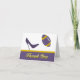 Cartão de agradecimento de casamento com tema de futebol elegante, feito em roxo, amarelo dourado e branco. Gráficos de um salto alto roxo desbotado chutando uma bola de futebol decorada em roxo, amarelo e branco adornam a frente do cartão e a parte superior interna. Uma faixa amarela e roxa, na parte inferior, tem texto gráfico em tom dourado que diz Obrigado. O texto preto dentro do cartão está pronto para ser personalizado.