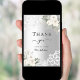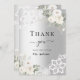 Um cartão de agradecimento de chá de noiva moderno e elegante. Um fundo com aparência prateada falsa. Decorado com rosas brancas, flores e renda. Na frente o texto: Obrigado, futura sra.