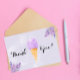 Este cartão de agradecimento de chá de noiva temático de lilás faz parte da coleção Ice Cream Social, apresentando um fundo pastel + flores, perfeito para concluir seu evento com estilo!