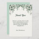 Cartão de agradecimento de chuvada de bebê com folhas de eucalipto verde. A mensagem agradece aos convidados por terem comparecido à chuvada.