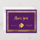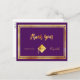 Um cartão de agradecimento para o graduado. Uma cor de fundo roxa feminina e uma moldura em ouro falso. Na frente, um estilo de letra à mão e o texto: Obrigado! Graduado, ano e um chapéu de formatura. Costas: Personalize e adicione sua nota de agradecimento e nome. Sem cor de fundo.