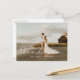 Elegante "Obrigado" com letra de assinatura moderna em branco, cartão postal de agradecimento de foto de casamento. A parte traseira do cartão apresenta um arranjo de flores silvestres em aquarela e várias linhas de texto de modelo para nomes, endereço e mensagem.