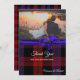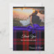 Cartão de agradecimento de casamento personalizado feito em papel cartão plano com gráficos do padrão xadrez clássico escocês do clã Brown e uma fita de cetim azul regência. A parte inferior da frente do cartão tem texto branco personalizável pronto para ser personalizado com sua foto de casamento e texto. Produtos de casamento marrons correspondentes estão disponíveis.