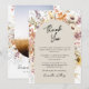 Pronto para celebrar com estilo? O nosso cartão de agradecimento de graduação boho flor de campo está repleto de charme floral. Ele apresenta um design floral em aquarela, 1 foto no verso e tipografia moderna. Personalize adicionando sua foto, nome, escola e outros detalhes. Encontre convites combinando na minha loja. Fotos por prostooleh / Freepik.