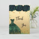 Um cartão de agradecimento de aniversário feminino e elegante. Um fundo com aparência de ouro falso, com brilho falso verde, faíscas, rosas verdes e um vestido verde. Na frente, uma grande letra manuscrita e o texto: Obrigado.