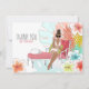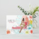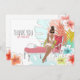 Cartão de agradecimento de festa de despedida de solteira na praia apresenta flores tropicais, brilho e noiva a ser festejada deitada. Disponível com cabelo loiro, castanho ou ruivo e tom de pele claro ou escuro.