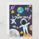 Divertido cartão de agradecimento para o primeiro aniversário com tema de astronauta no espaço, astronomia e crianças fofas.