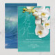 Cartão do dia das mães com orquídeas com mensagem de agradecimento. Letras grandes no topo. Exemplo é "Amo você Nanna" com parágrafo para sua mensagem. Orquídeas brancas realistas decoram cartões azul-esverdeados com fundo de água do oceano. Mais água está no verso, e o design vem como download instantâneo, bem como impresso com papel de alta qualidade.