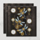 Marcadores e teclas antigas com engrenagens de ouro e latão, decoradas com libélulas mecânicas e boias em fundo castanho e listrado.