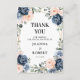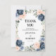Cartão de agradecimento de casamento floral geométrico azul empoeirado com elegantes buquês de azul escuro / azul empoeirado, branco, rosa, rosa pêssego e folhas de eucalipto verde-sage e moldura geométrica neutra com brilho elegante. Por favor, entre em contato comigo para qualquer ajuda na personalização ou se você precisar de qualquer outro produto com este design.