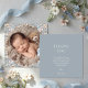 Featuring a beautiful watercolor floral wreath that encircles your baby's photo, this card is set against a trendy, soft dusty blue background.