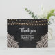 Expresse sua gratidão com o nosso cartão de agradecimento de casamento Rustic Elegance. Este cartão lindamente projetado apresenta um fundo de madeira rústica preta adornado com luzes delicadas e detalhes de renda inspirados em henna. A combinação de fontes em branco, com letras vintage e negrito, cria uma mensagem elegante e sincera.