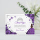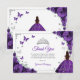 Purple silver and white Quinceanera thank you card. Features brunette girl in ball gown dress, script font, silver butterflies, purple roses and tiara. Perfect for an elegant princess style glam celebration. Personalize with your own details.