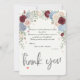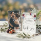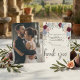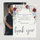 Express your gratitude with a sophisticated botanical design featuring deep crimson blooms gracefully framing your favorite custom newlywed picture.This design features a highly legible typographic hierarchy, pairing classic serif body text with an elegant handwritten calligraphy script for the appreciation message. The visual composition centers a custom couple's portrait photograph, formally framed by soft corner clusters of deep maroon blooms, dusty blue botanicals, and cream floral accents against a crisp, high-contrast background. The blend between the rich color palette and subtle pastel tones establishes a timeless garden aesthetic, while a small heart icon anchors the layout.This is a flat printed image with a soft watercolor painted effect, not actual raised material or textured canvas.