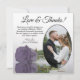 Estes belos cartões de agradecimento de casamento são uma maneira maravilhosa de mostrar seu apreço aos seus amigos e família por celebrar com você no seu dia especial. Eles apresentam sua foto de casamento em uma moldura oval com um solteiro roxo empoeirado e empoeirado, deitado de lado refletindo na água. O título diz "Obrigados e amor" com espaço para uma nota e assinatura personalizadas. Clássico, romântico e sofisticado, estas cartas são a forma perfeita de concluir a sua celebração de casamento.