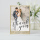 Obrigado os teus convidados de casamento em estilo com este elegante obrigado de fotografia personalizado. Esta design de tipografia mostra sua foto na frente bordada em ouro falso com as palavras "Obrigado" e seus nomes com data de casamento para personalizar. A parte de trás do cartão postal tem uma mensagem personalizada e uma assinatura em um fundo dourado falso. Desenhada pela artista Susan Coffey.