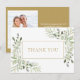 Características folhas delicadas de aquarela emoldurando a sua mensagem de agradecimento definida em tipografia elegante em ouro. Você pode personalizar com a sua foto especial e mensagem de agradecimento no verso ou, se preferir, adicionar a sua própria mensagem manuscrita, eliminando o texto. Uma forma perfeita de dizer obrigado! Concebido por Thisisnotme©