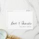 Cartões de agradecimentos de Obrigados e amor preto-e-branco com script elegante. O Design tem Love & obrigados Escritos em caracteres de classe negra junto com os nomes das recém-casadas em um fundo branco. A parte traseira da placa tem outros detalhes. Este cartão faz parte de uma coleção. Personalize-o mudando os nomes da noiva e do noivo e a data do casamento. Para mais personalizações, contacte-me em mypaperlove2021@gmail.com