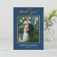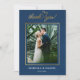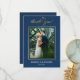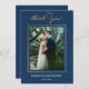 Este cartões de agradecimentos de fotos simples e minimalista apresenta um texto elegante de script dourado com um coração entre as palavras "obrigado você". Você pode personalizar o design adicionando os nomes da noiva e do noivo, a data, a mensagem aos amigos e à família, e a sua foto favorita. Este cartão faz parte da Coleção Colorida Dourada de Casamentos de Lily Tropicais; por favor, procure na minha coleção mais itens de casamento correspondentes. A placa vem em quatro cores de fundo: lacre, azul, preto e branco.