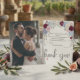 Expresse sua gratidão com um sofisticado design botânico com flores profundas de cor carmesim que emolduram graciosamente a sua foto favorita de recém-casados. Este design apresenta uma hierarquia tipográfica altamente legível, combinando texto clássico em serifa com uma elegante caligrafia manuscrita para a mensagem de agradecimento. A composição visual centra uma fotografia personalizada do casal, formalmente emoldurada por suaves aglomerados de flores de cor vinho, elementos botânicos em azul desbotado e sotaques florais em creme contra um fundo nítido e de alto contraste. A combinação entre a rica paleta de cores e tons pastéis sutis estabelece uma estética de jardim atemporal, enquanto um pequeno ícone de coração fixa o layout. Esta é uma imagem impressa plana com um efeito de pintura em aquarela suave, não material realçado ou tela texturizada.