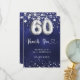 Um cartões de agradecimentos para 60 anos. Uma cor azul de fundo do marinho. A cor azul é irregular. Com estrelas de falso prata. Na frente: número 60 escrito com uma fonte no estilo do balão. Obrigado, seu texto, título e uma data. Voltar: Personalize e adicione seu nome e nota de agradecimento.