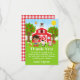 Este cartão de agradecimento fofo e divertido apresenta uma menina de cabelo castanho com pele escura ao lado de um celeiro vermelho com um cata-vento de galo. Existem adoráveis animais de fazenda, como uma vaca, porco e galinha. Ao fundo, há um céu azul brilhante, árvores de maçã, sol, borboletas e margaridas. O texto combina fontes em negrito e sem serifa para um visual elegante e moderno. Isso é perfeito para uma festa de aniversário com tema de fazenda.