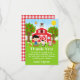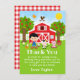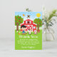 Este cartões de agradecimentos giro e divertido apresenta um cabeleireiro preto com pele justa ao lado de um celeiro vermelho com uma vana de vento de galo. Há animais de fazenda adoráveis como uma vaca, porco e galinha. Ao fundo está um céu azul brilhante, macieiras, sol, borboletas e margaridas. O texto combina fontes em negrito e sans serif para uma aparência na moda e moderna. Isto é perfeito para uma festa de aniversário temática fazenda.