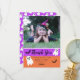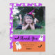 Listras ousadas de laranja e roxo de outono acentuam o design da frente deste cartão simples de agradecimento com a foto de fantasmas e morcegos com a mensagem "Obrigado por tornar meu aniversário boo-ti-ful". A frente também apresenta alguns morcegos junto com alguns fantasmas pequenos e fofos. A parte de trás apresenta um padrão repetido de fantasmas em um fundo roxo. Personalize com o nome, bem como sua foto exclusiva. Todo o texto e elementos podem ser movidos e alterados conforme desejado. Design por Holiday Hearts Designs (direitos reservados) com crédito da foto do modelo para Sobima via Pixabay.