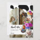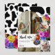 Cartão de agradecimento de aniversário temático Vaca Sagrada. O design apresenta um fundo com estampa de vaca preta e branca, um arco de foto branco, duas vacas fofas com adornos florais coloridos e vibrantes em estilo aquarela e uma divertida mensagem de agradecimento.