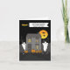Uma simples ilustração de uma casa assombrada à noite, que é decorada com luzes de fada. Fantasmas, ossos e morcegos acompanham a imagem. Um avião está voando sobre a casa que tem um estandarte atrás dele que diz 'Feliz Halloween a um sobrinho neto muito especial'.
