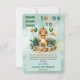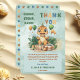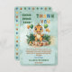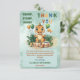 Tão emocionante! Para onde foi o último ano? Ele voou, não foi? É hora de celebrar o seu pequeno em estilo pré-histórico com este fofo design de festa de 1º aniversário "Chomp, Stomp, Rawr!" "Nosso Pequeno Dinossauro Está Fazendo 1 Ano" para meninos. Perfeitamente coordenado em tons naturais de verde escuro, azul escuro, ferrugem, bege areia e azul teal pálido e suave, ele prepara o cenário perfeito para a sua celebração com tema pré-histórico. O pequeno dinossauro fofo tem um grande sorriso no rosto enquanto usa um chapéu de festa, algumas velas acesas e está cercado por presentes e balões em um cenário de verde com tema de selva. As letras de "Dinossauro" e a idade "1" são feitas em uma fonte personalizada com tema de dinossauro. Tudo é colocado sobre um fundo de aquarela azul teal claro. A parte de trás apresenta um padrão de pegadas de din