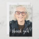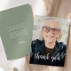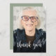 A frente deste convite de 90 apresenta a foto do convidado de honra com as palavras "obrigado você" na elegante cobertura de script de caligrafia branca. Uma tela escura ajuda a tornar o texto pop. Personalize o lado inverso com sua mensagem pessoal na fonte de sans serif branca e seu nome no script em um plano de fundo verde sage.