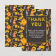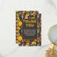 Cartão de agradecimento com tema de construção amarelo para festa de aniversário de menino, apresentando trator de obras, cones de tráfego de rodovia (chapéus de bruxa), sinalização de advertência e outros equipamentos, tudo sobre um fundo cinza escuro. Uma ótima maneira de dizer obrigado àqueles que compareceram à festa de aniversário do seu filho e pelos presentes. Personalize alterando o título e adicione sua própria mensagem; a mensagem atual diz "obrigado por vir à minha festa, foi ótimo ter você lá e obrigado pelo meu presente, com amor Mckenzie".