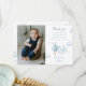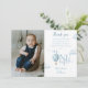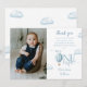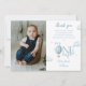 Este encantador cartão de agradecimento de foto de primeiro aniversário apresenta um lindo balão de ar quente azul e nuvens. Criado por Thisisnotme©