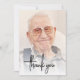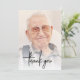 A frente deste cartão de agradecimento de aniversário de 90 anos apresenta a foto do homenageado com as palavras "obrigado" em letras manuscritas modernas em preto sobrepostas. Uma tela branca ajuda a fazer o texto se destacar. Personalize o verso com sua mensagem pessoal em fonte sans serif preta e seu nome em letras cursivas em um fundo bege.