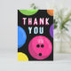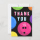 Cartão de agradecimento preto e neon projetado para festas de aniversário de boliche para crianças, mas pode ser usado para outros eventos com tema de boliche (por exemplo, eventos corporativos de boliche, arrecadações de fundos de boliche, reuniões familiares de boliche).