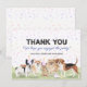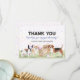 Obrigado seus hóspedes por juntar-se à comemoração de aniversário do seu precioso com este design de festas de cachorro giro e divertido com cães, chapéus de festas e confete. As palavras "Obrigado" estão num texto impresso de pata divertido. Use os modelos fornecidos para personalizá-los com sua mensagem e nomes. Você também pode mudar as cores do texto azul e/ou preto para o seu favorito.