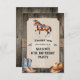 Monte e galope para uma festa de aniversário divertida com tema de passeio a cavalo. Um fundo de tábua de madeira sugere o interior de um estábulo com um painel segurado por tiras de aniagem. O painel de cor creme tem uma marca d'água de cavalo. No topo, um cavalo está selado para agradecer aos convidados por participarem de um dia divertido com cavalos. Um par de botas de cowboy e um chapéu de cowboy estão colocados em direção ao fundo do cartão com ornamentos de estilo ocidental acentuando o design. Disponível com produtos correspondentes.