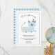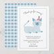 Cartão de agradecimento de festa de aniversário fofo para a festa temática de gato do seu filho. Ilustração de um gato azul com um sorriso no rosto usando um chapéu de festa. O texto acima diz "obrigado por vir!" e o texto abaixo entra em mais detalhes agradecendo ao amigo por participar do evento e pelo presente que trouxe. Você pode adicionar o nome do seu filho na parte inferior. Os textos são facilmente editáveis online.